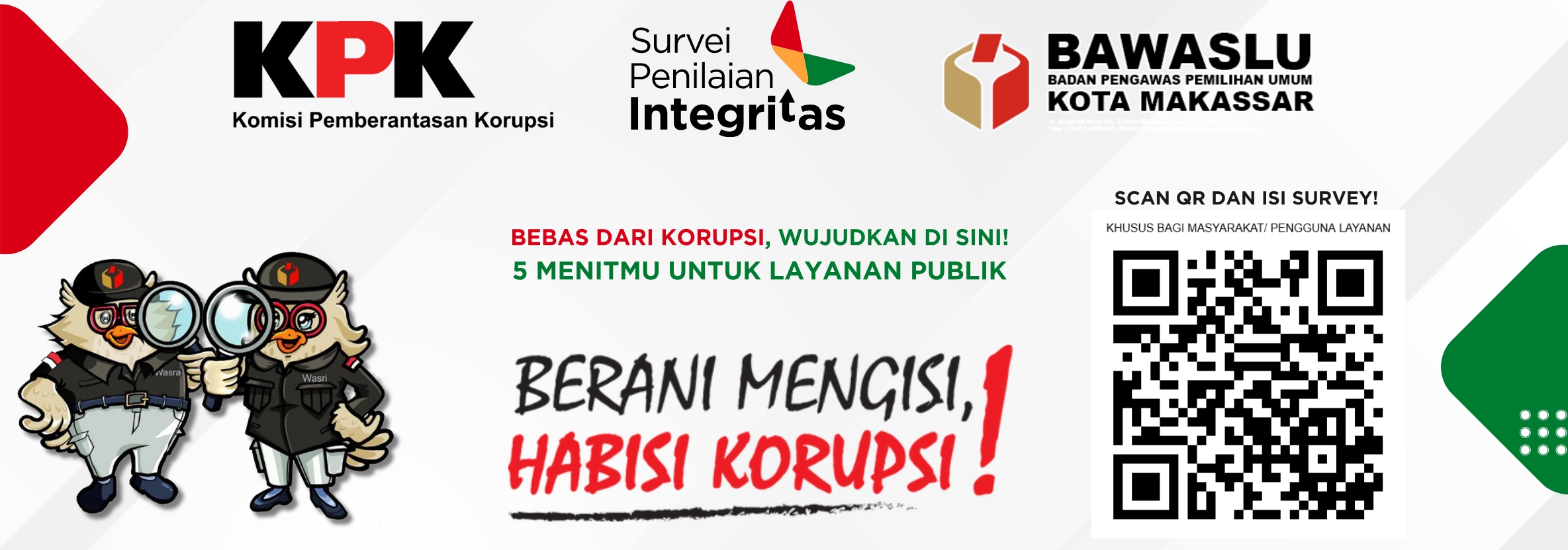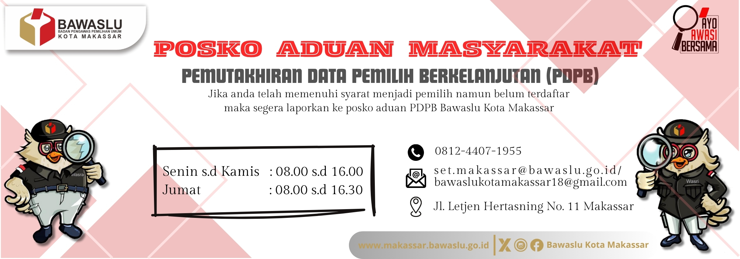 Pengumuman Contoh Pengumuman Lihat Selengkapnya Lapor Pelanggaran Pemilu Hasil Pengawasan Tahapan Pemilu 2024 Ajukan Permohonan Sengketa Proses Pemilu Bagaimana Cara Ikut Awasi Pemilu Lapor Hoaks Pemilu Apa Saja Yang Diawasi Pada Tahapan Pemilu Berita Bawaslu Kota Makassar Serahkan Laporan Evaluasi Program Jumat Sehati dan Jumpa Berlian ke Bawaslu RI humas Kamis, Desember 11, 2025 - 19:47 Lensa Pengawasan: Arga dan Cahaya Demokrasi Kota Daeng (Bagian 6 - PantauKita.id) humas Rabu, Desember 10, 2025 - 11:59 Sekjen Bawaslu RI Tekankan Pentingnya Sinergi, Tata Kelola, dan Pemetaan Karier ASN dalam Rapat Kerja Teknis Kesekretariatan 2025 humas Selasa, Desember 9, 2025 - 11:01 Bawaslu Kota Makassar Desak KPU Kota Makassar Buka Data 73.000 Pemilih Tidak Dikenali humas Senin, Desember 8, 2025 - 15:00 Lensa Pengawasan: Arga dan Cahaya Demokrasi Kota Daeng (Bagian 5 - Bayangan di Balik Poster) humas Kamis, Desember 4, 2025 - 10:42 https://sigaplapor.bawaslu.go.id/ https://ppid-makassar.bawaslu.go.id https://sips.bawaslu.go.id/ https://google.com https://jdih.bawaslu.go.id/ Galeri Pencarian Saran dan Pengaduan Saran dan pengaduan dengan untuk kemajuan Bawaslu Ajukan